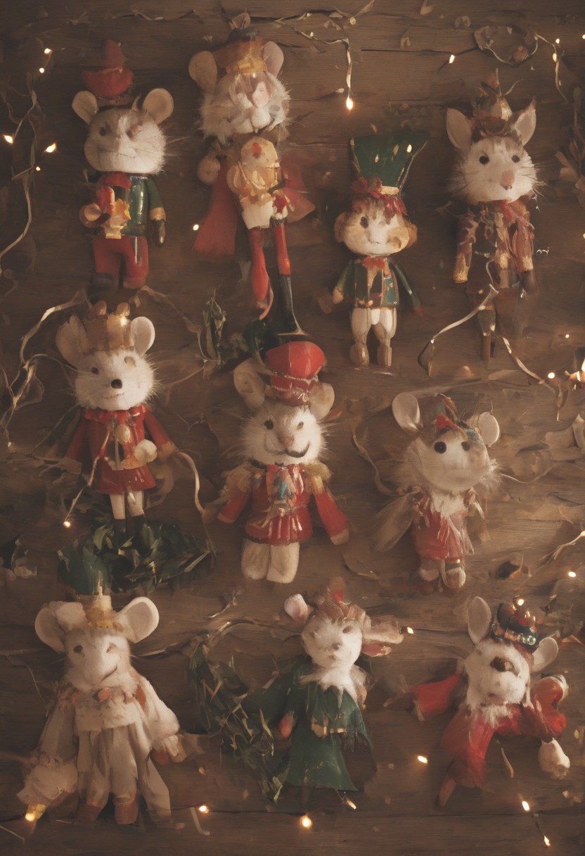 rating_pg. cartoonish, hollyday nutcrackers, wooden, christmas background, lights, smile, mouses. Vibrant atmosphere, festive spirit