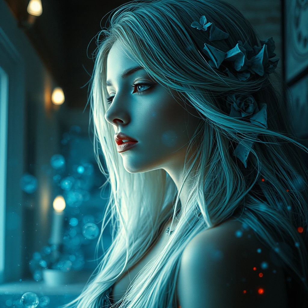 by Bastien Lecouffe-deharme , By carne griffiths and wadim kashin, scifi artwork by roblunda mccallum, in the style of blink-and-you-miss-it detail, full body, dark white and light blue, sci-fi realism, pulp comics, airbrush art, Rembrandt scheme lighting, A stunningly realistic (((3d Alcohol Ink double exposure illustration))), where the main image is a (captivating rococo Sweden model at her bedroom, thick goth woman, film grain, shot with an iphone front camera,) with intricate details and a (long exposure backdrop) that meld together in a (softly blended double exposure effect). The interplay of colors and (iridescent,patterns) creates a surreal optical illusion, with a (fantastical anthropomorphic blonde haired female figure) whose and (extremely long, flowing hair) blends seamlessly with the (ethereal surroundings). The overall atmosphere exudes an air of (fantasy and enchantment) that makes the piece a (masterful artistry) Awe inspiring , surreal structured mix media art,, art by Luzia Caldari, Carne Griffiths and Vanessa Barragao. Coherent background, Close-up, stitching in bright colors, 3D-effect artwork, 3d vector painting, sharp focus, beautiful, highly detailed, concept art, stunning, molecular, textures, breathtaking beauty, pure perfection, divine presence, unforgettable, impressive, breathtaking beauty, Volumetric light, rays, vivid colors reflects, centered, symmetry, painted, intricate, volumetric lighting, beautiful, rich deep colors masterpiece, sharp focus, ultra detailed, in the style of dan mumford and marc simonetti, stunning visuals, intricate, stunning visuals dark makeup