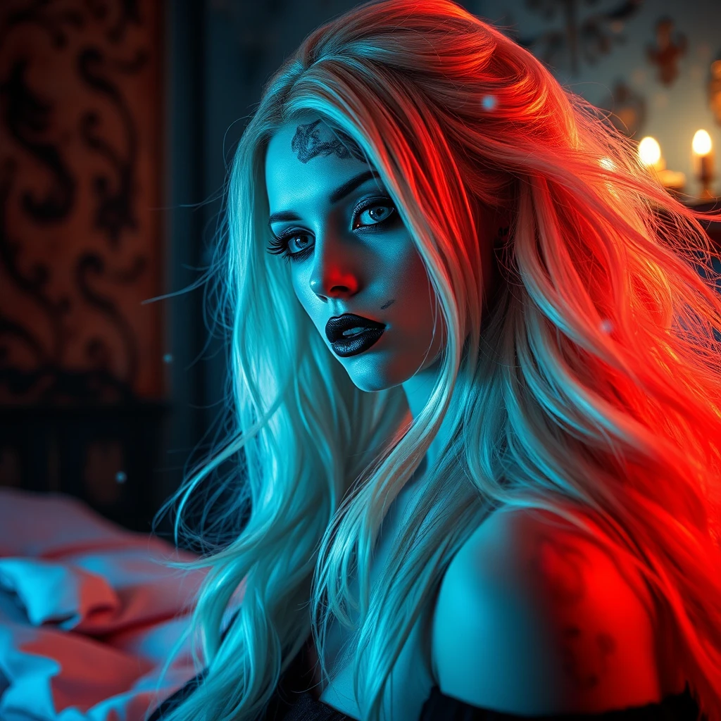 dark makeup, scifi artwork by roblunda mccallum, in the style dark makeup gothik, full body, dark white and light blue, sci-fi realism, pulp comics, airbrush art, Rembrandt scheme lighting, A stunningly realistic photo HD 4k, where the main image is a (captivating rococo Sweden model at her bedroom, thick goth woman, film grain, shot with an iphone front camera,) with intricate details and a (long exposure backdrop) that meld together in a (softly blended double exposure effect). The interplay of colors and (iridescent,patterns) creates a surreal optical illusion, with a (fantastical anthropomorphic blonde haired female figure) whose and (extremely long, flowing hair) blends seamlessly with the (ethereal surroundings). The overall atmosphere exudes an air of (fantasy and enchantment) that makes the piece a (masterful artistry) Awe inspiring , surreal structured mix media art,, art by Luzia Caldari, Carne Griffiths and Vanessa Barragao. Coherent background, Close-up, stitching in bright colors, 3D-effect artwork, 3d vector painting, sharp focus, beautiful, highly detailed, concept art, stunning, molecular, textures, breathtaking beauty, pure perfection, divine presence, unforgettable, impressive, breathtaking beauty, Volumetric light, rays, vivid colors reflects, centered, symmetry, painted, intricate, volumetric lighting, beautiful, rich deep colors masterpiece, sharp focus, ultra detailed, in the style of dan mumford and marc simonetti, stunning visuals, intricate, stunning visuals