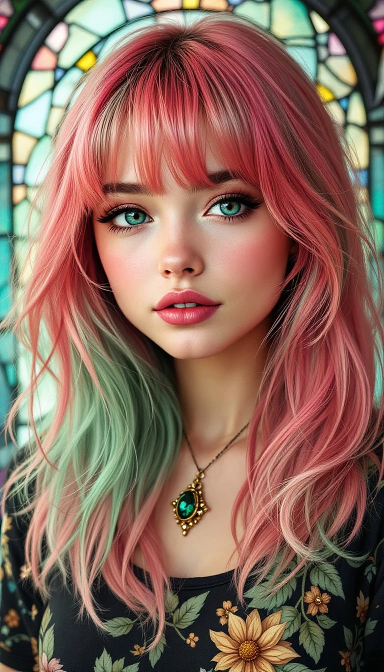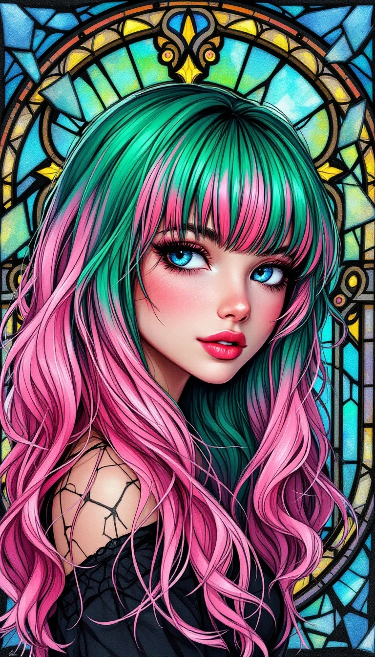 The Art of Jasmine Becket- Griffith, Style of How to Draw Manga and Anime, A woman with hair ombre blending between pink and green, choppy bangs, cute and Kawaii, stained glass broken background, captivating art enthusiasts, joyous atmosphere, vibrant, =