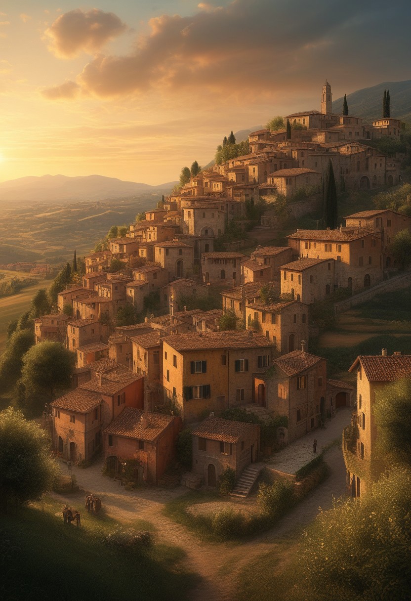 Epic, amazing lens glow lighting illuminates a modern, futuristic, grand scene in golden hour light, reflecting the darker aspects of the human condition. Romantic realism style shows an Italian countryside village with warm colors, textured brushwork, and serene landscapes. Soft light depicts heroic elements in a massive scale.