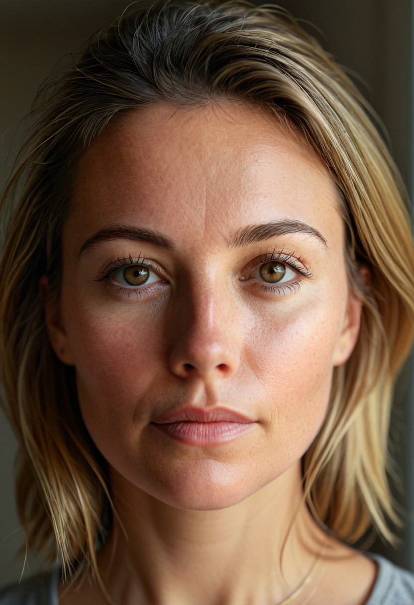 "Capture an ultra-realistic, hyper-detailed 8K portrait of a 40-year-old woman with natural skin, minimal makeup, and an authentic expression. The subject is illuminated by soft, natural window light, creating gentle shadows and a warm atmosphere. Photographed with a Nikon D5300 and a 50mm f/1.8 lens, ensuring crisp detail and shallow depth of field. Every pore, hair strand, and subtle skin imperfection is rendered with lifelike precision. The lighting mimics golden-hour tones, casting a cinematic glow across her face while maintaining a true-to-life balance of highlights and shadows."