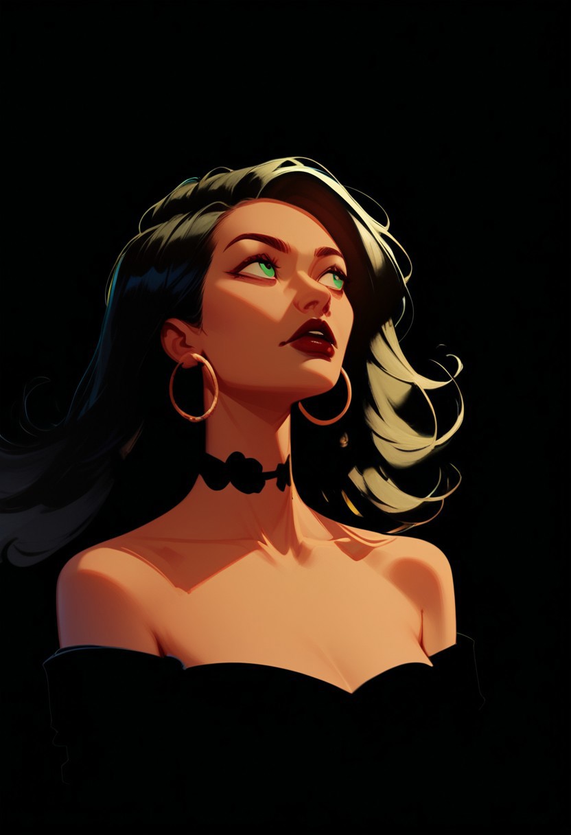 Blend_in, black background, score_9, score_8_up, score_7_up, masterpiece, best quality, absurdres, vibrant, highly detailed, (full front), upper body, 1girl, solo, 38 y.o gorgeous MILF, (green eyes:0.6), long black hair, open hair, hoop earrings, black satin choker, (tanned skin:0.6), matte red lipstick, strapless dress, off-shoulder dress, black elbow gloves, bare shoulders, collarbone looking away, looking to the right side, arms at sides, pitch black background, high contrasts, (light from right side:1.2)