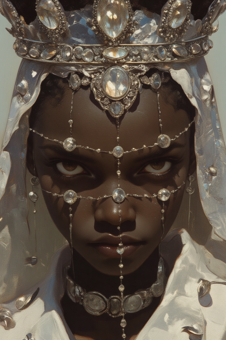 A highly stylized hyper-realistic portrait of a dark-skinned woman, her expression stoic and devoid of emotion, as she gazes directly into the viewer’s eyes. She wears a symmetrical chrome silver crown, its sparkling diamonds arranged in a flawless, geometric fashion that crowns her head with regal elegance. The crown catches the light, casting dazzling reflections that highlight the sharp angles of her face. A diamond-encrusted necklace adorns her neck, complementing the crown with its intricate design, each diamond sparkling brightly against her skin. A fine face ornament, known as the “diamond cascade,” stretches across her face in delicate silver chains, each studded with small, radiant diamonds. The chains follow the curve of her face, crossing her forehead and cheeks in a symmetrical fashion, creating a striking contrast with her dark skin. The soft light reflects off the diamonds, creating a luminous, surreal effect around her, emphasizing the ethereal beauty of the face ornament and her unyielding, emotionless gaze.