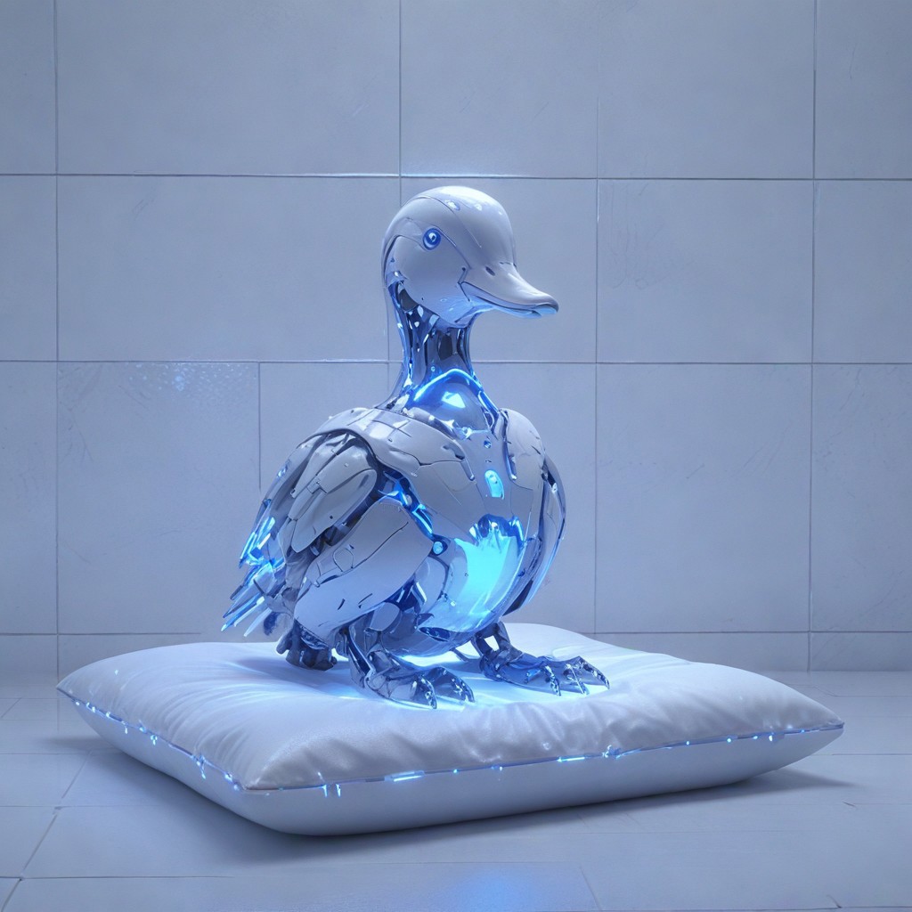 SilverPulse robot duck, on a white pillow, tile wall, animal, bird, surrounded by eggs, futuristic, science fiction, blue glow