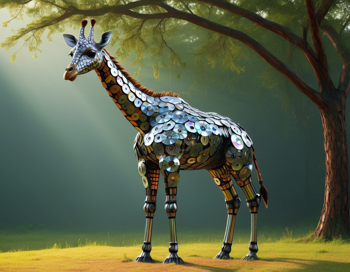 giraffe ((made of cd's))<lora:CDs_SDXL:1>, steampunk scenery, Victorian vision, majestic masterpiece