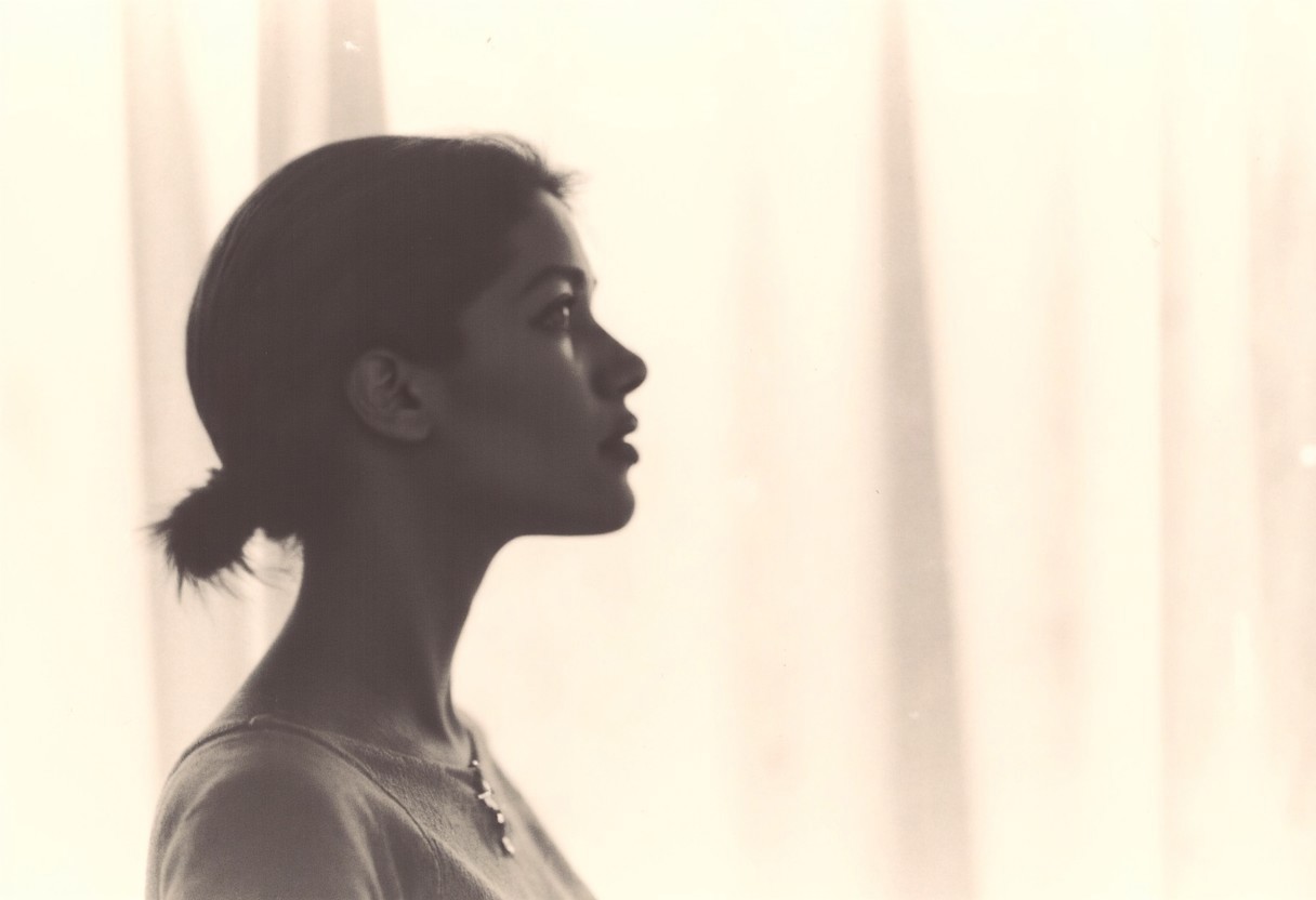 an aesthetic, minimalist depiction of a female profile in side view. The focus is on the soft contours and calm, monochromatic tones. The scene feels mystical and dreamy, almost as if viewed through a delicate mist, with gentle light accentuating the silhouette. The background is diffuse and creamy white, drawing attention to the elegant simplicity of the figure.