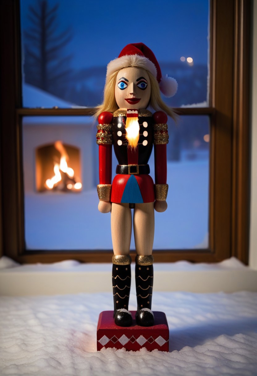 wooden Harley Quinn nutcracker, christmas, living room, scenery, window, fire place, night, cozy, snow,