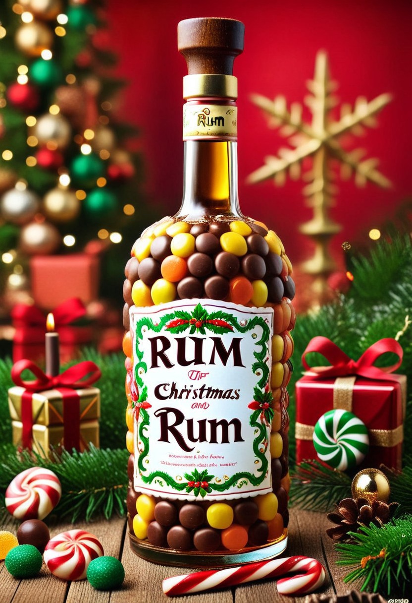 masterpiece, absurdres, best quality, CHRC4ND7, RUM bottle with rum and candy inside, chirstmas advertisement, fake magazine cover