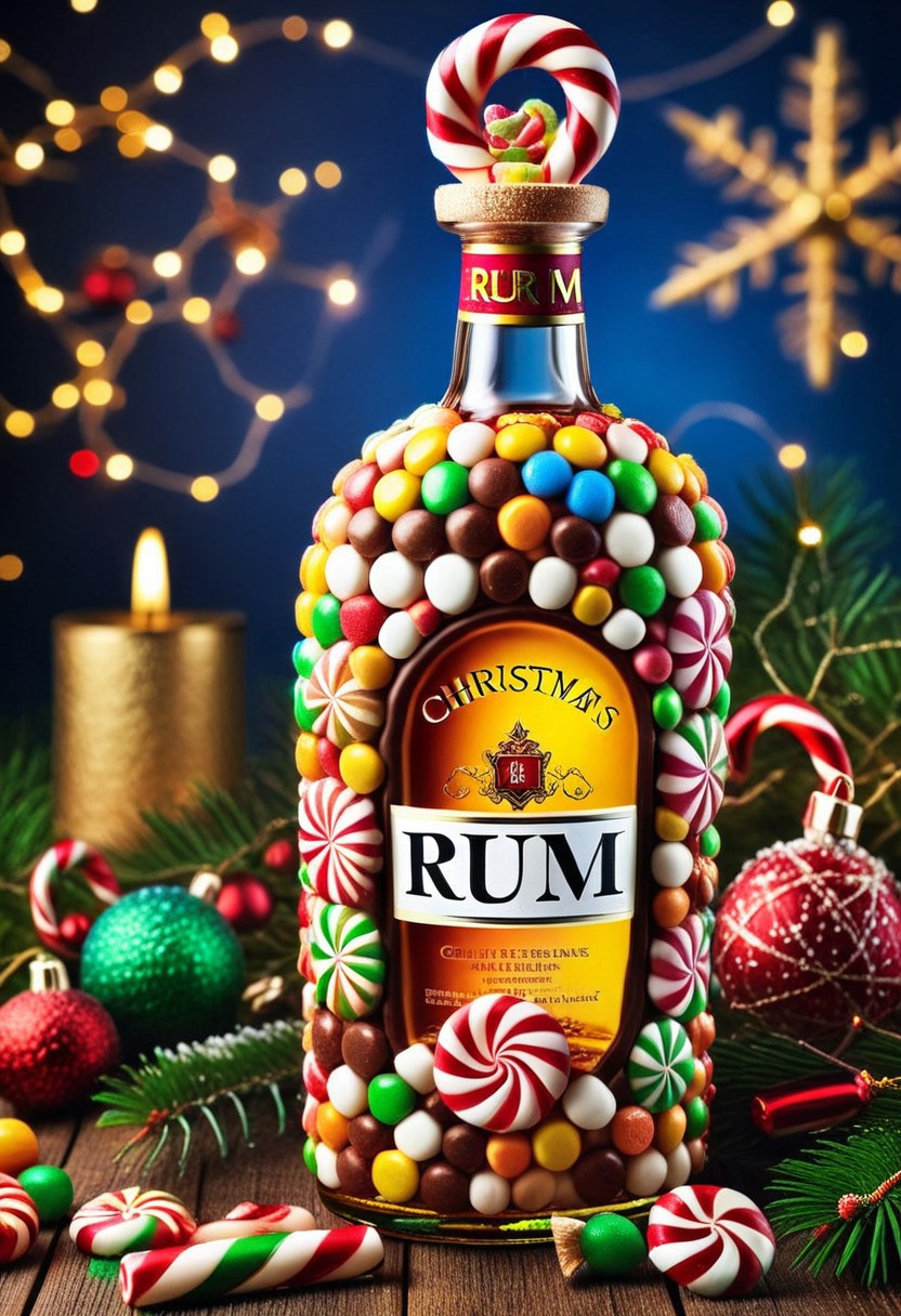 masterpiece, absurdres, best quality, CHRC4ND7, RUM bottle with rum and candy inside, chirstmas advertisement, fake magazine cover