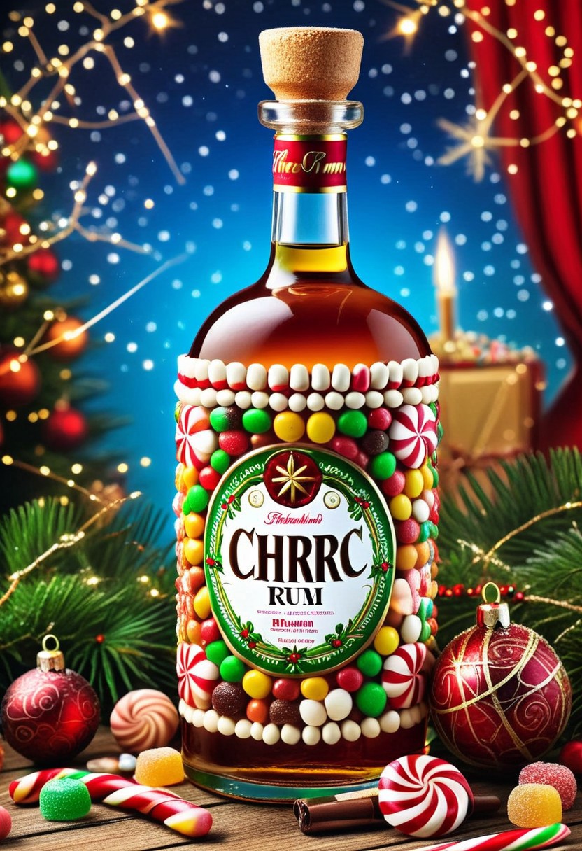 masterpiece, absurdres, best quality, CHRC4ND7, RUM bottle with rum and candy inside, chirstmas advertisement, fake magazine cover