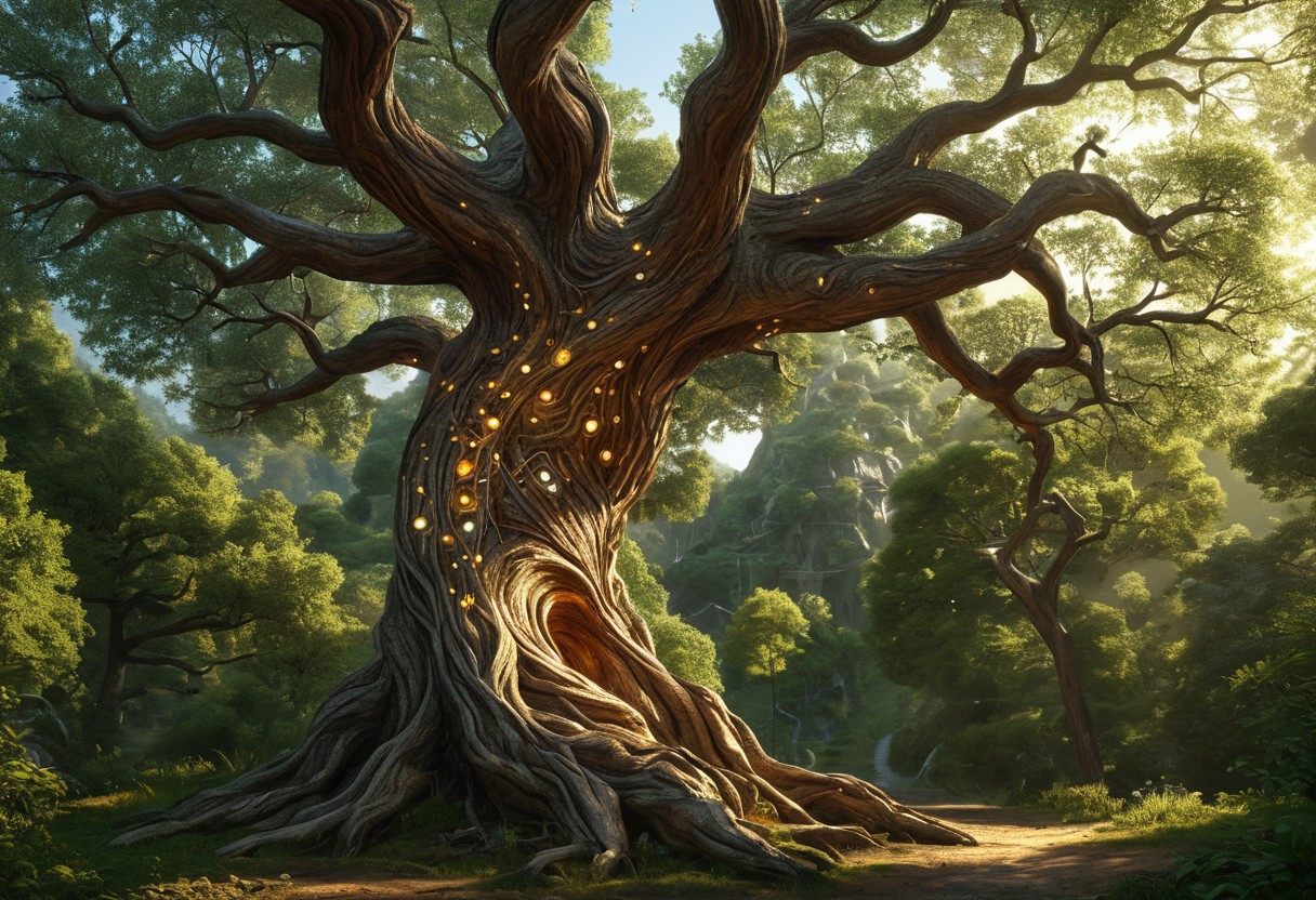 Masterpiece, best quality, amazing detail, nature, scenery, tree, magic tree, double helix trunk, no humans, glowing