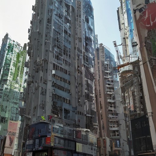 tall, narrow, tower, dystopian, black, Hong Kong, billboards, air conditioning units, short buildings around the main building