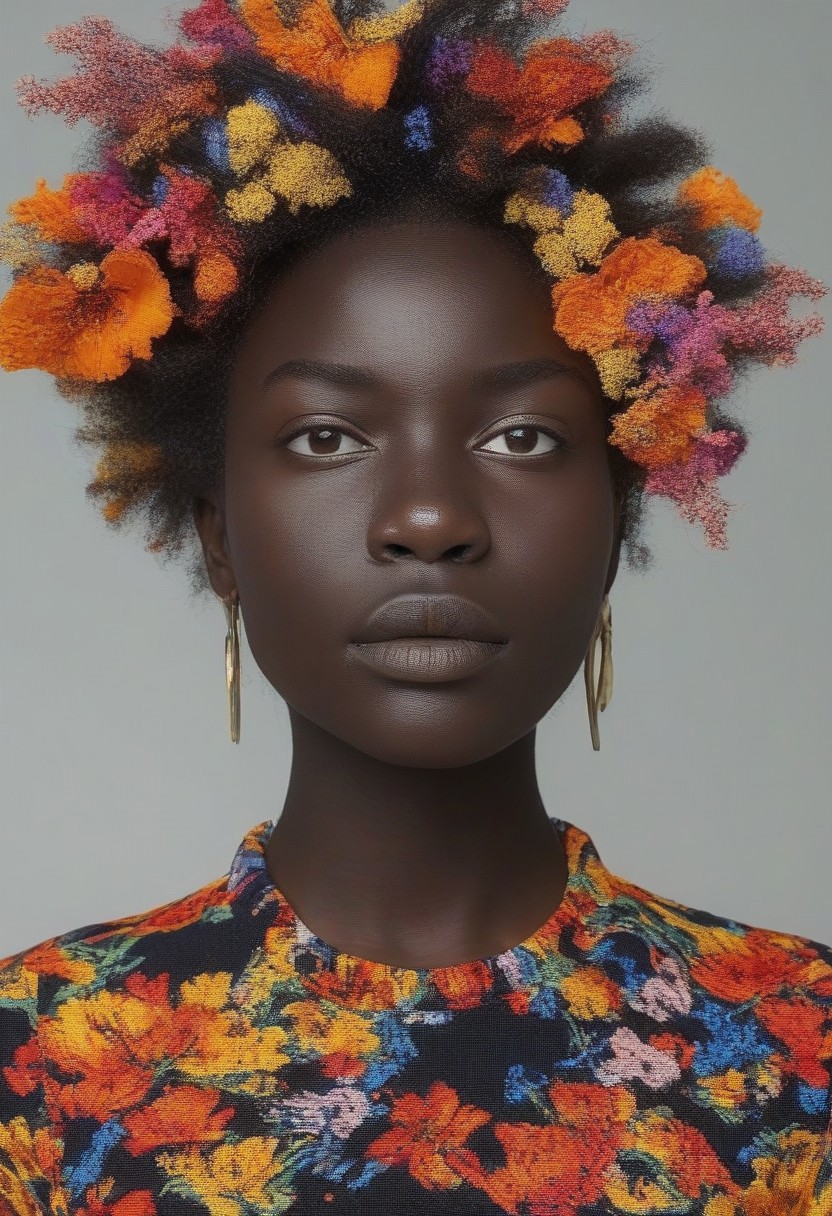 kenyan black beautiful woman , colorful with flowers entwined in her hair, petrifies with a single gaze, awardwinning, masterpiece, unaestheticXL_Alb2