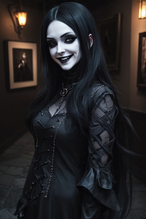 pale goth vampire woman, wicked smile, fangs, gloomy art gallery at night, lighting creates an ominous atmosphere, eldritchtech, (wraith:1.2) <lora:CosmicEldritchTech:0.5> <lora:fangs:0.5> fangs