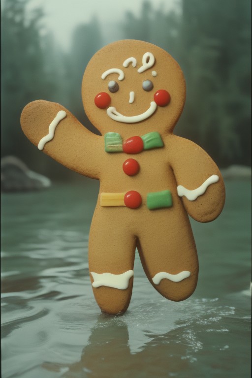 ArsMovieStill, movie still from a 1970s technicolor Sci-Fi movie, Gingerbread_Man, food, cookie, food focus, no humans, Walking on a lake of milk