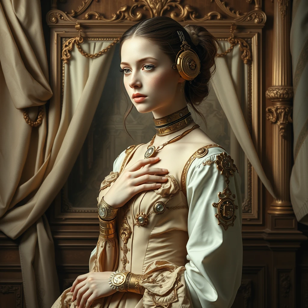 A breathtaking Baroque-inspired painting featuring a girl with cybernetic semblances, set against a luxurious backdrop of ivory and wood. The girl, adorned in an elegant gown that gracefully blends traditional fabric with futuristic elements, gazes thoughtfully with an expression of serenity and strength. Her cybernetic enhancements, intricately designed in gold and ivory tones, harmoniously complement her natural beauty. The background is filled with opulent Baroque details—lush draperies, ornate frames, and soft, dramatic lighting that casts elegant shadows. This highly detailed image captures the fusion of classical art and modern technology, rendered in exquisite 4K resolution