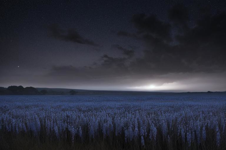 over looking a small woody field, isolated trees in tall grassy savanna, further in the distance reddish mountains, blue savanna grass, blue flowers dot the savanna, dusty glitter blown in the air, dusty, dust storm, ((night time)), cloudy, raining, (very dark surroundings)