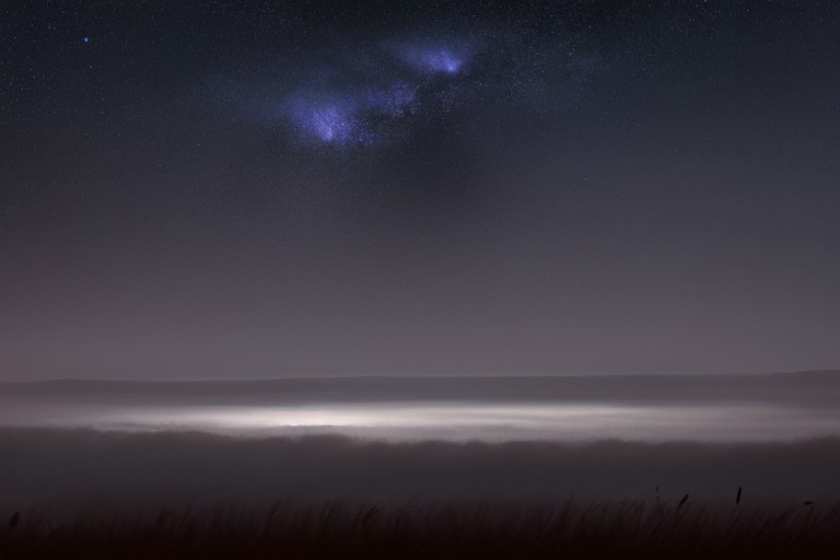 over looking a small woody field, isolated trees in tall grassy savanna, further in the distance reddish mountains, blue savanna grass, blue flowers dot the savanna, dusty glitter blown in the air, dusty, dust storm, ((night time)), cloudy, raining, ((very dark surroundings))