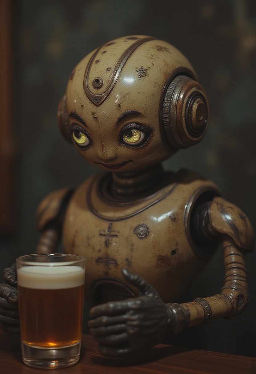 Raw photo, 8k uhd, dslr, , little rusty robot with raised hands enjoys a beer, big smile. soft lighting, high quality, film grain, Fujifilm XT3,dark, intricate details, sharp, (skin texture:1.1).