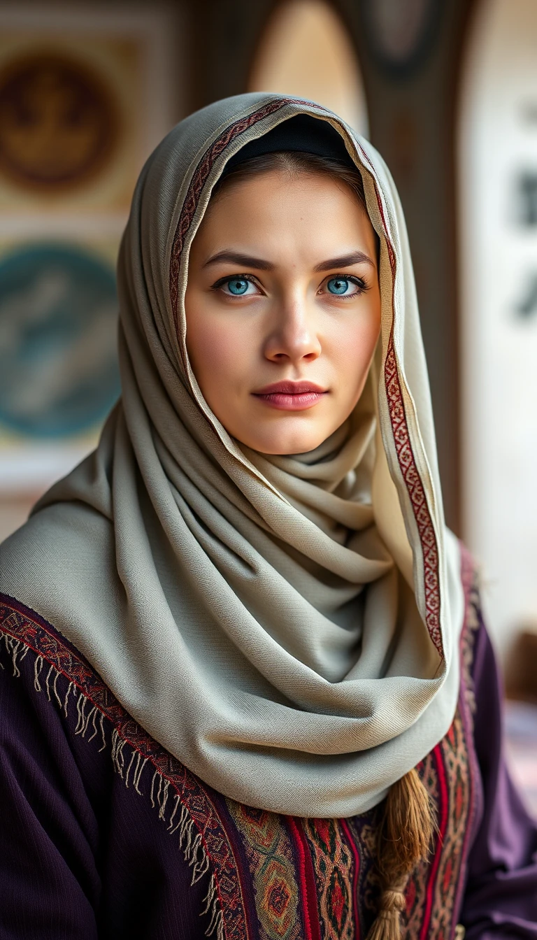 make a Muslim woman with blue eyes, this woman originates from the interior of China, from the Uygur tribe. Her clothing is traditional to her tribe, and she is in a Uygur mosque in the mountains of China.