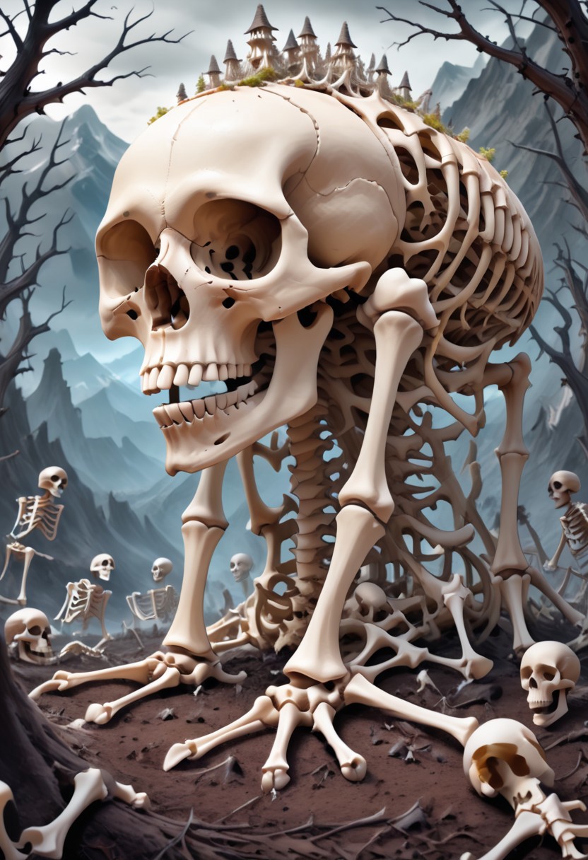 masterpiece, hd, ultra detailed, skeleton mountain mountain, skeleton forest, spooky, boneswm