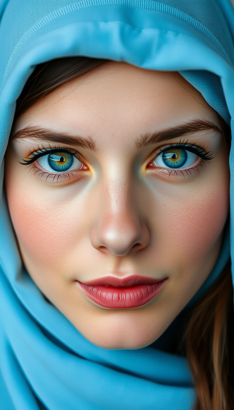 make a young Muslim woman, with green eyes, a striking face, a thin nose. This woman wears a light blue hib