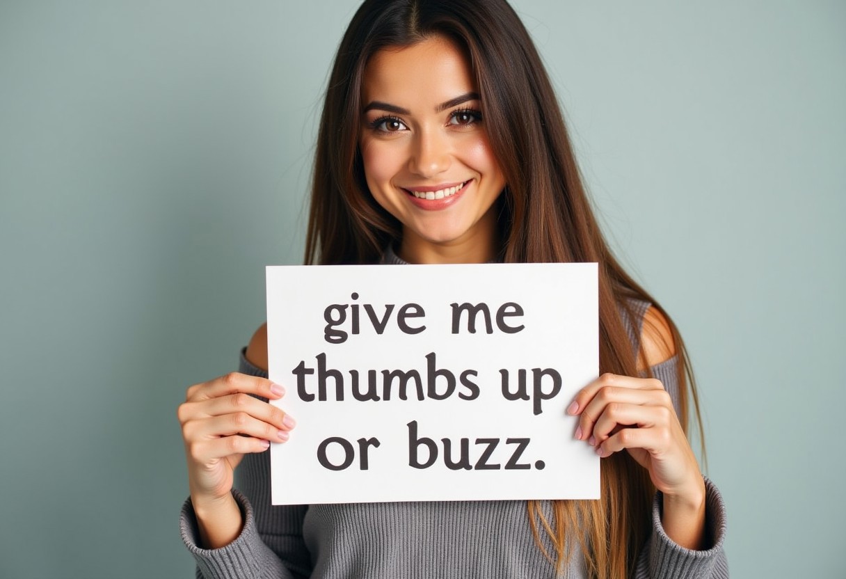 beautiful woman holding a sign it says "give me thumbs up or buzz",