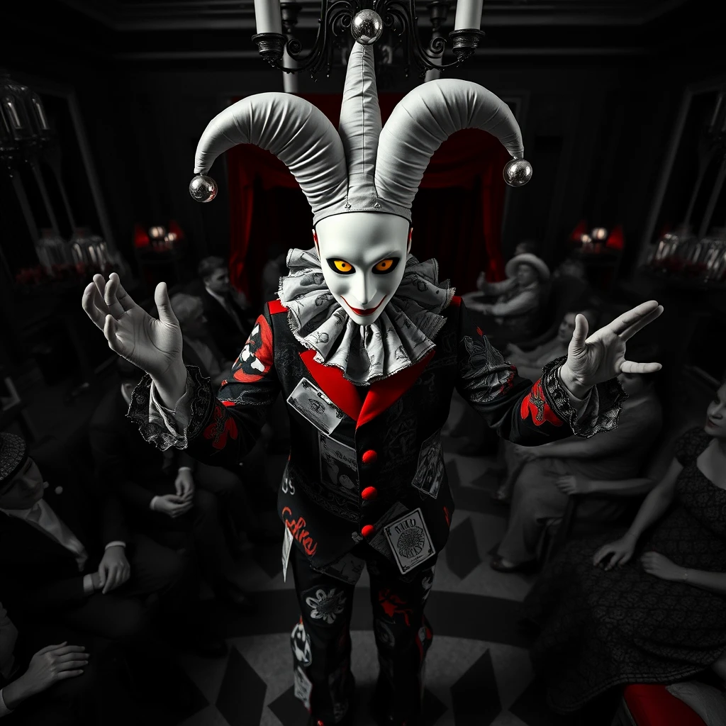 top view, most insane a Commedia dell'arte-style photo, a strange man in a white Jester mask dancing in the center, glass yellow eyes, three-tailed headdresses with bells on his head, a black and red suit sewn from different patches resembling the image of the highest arcana of Tarot cards, people in Victorian clothes sitting in the background, the hall is decorated in Art Deco style, monochrome one vivid red yellow element, ultra real, black and white