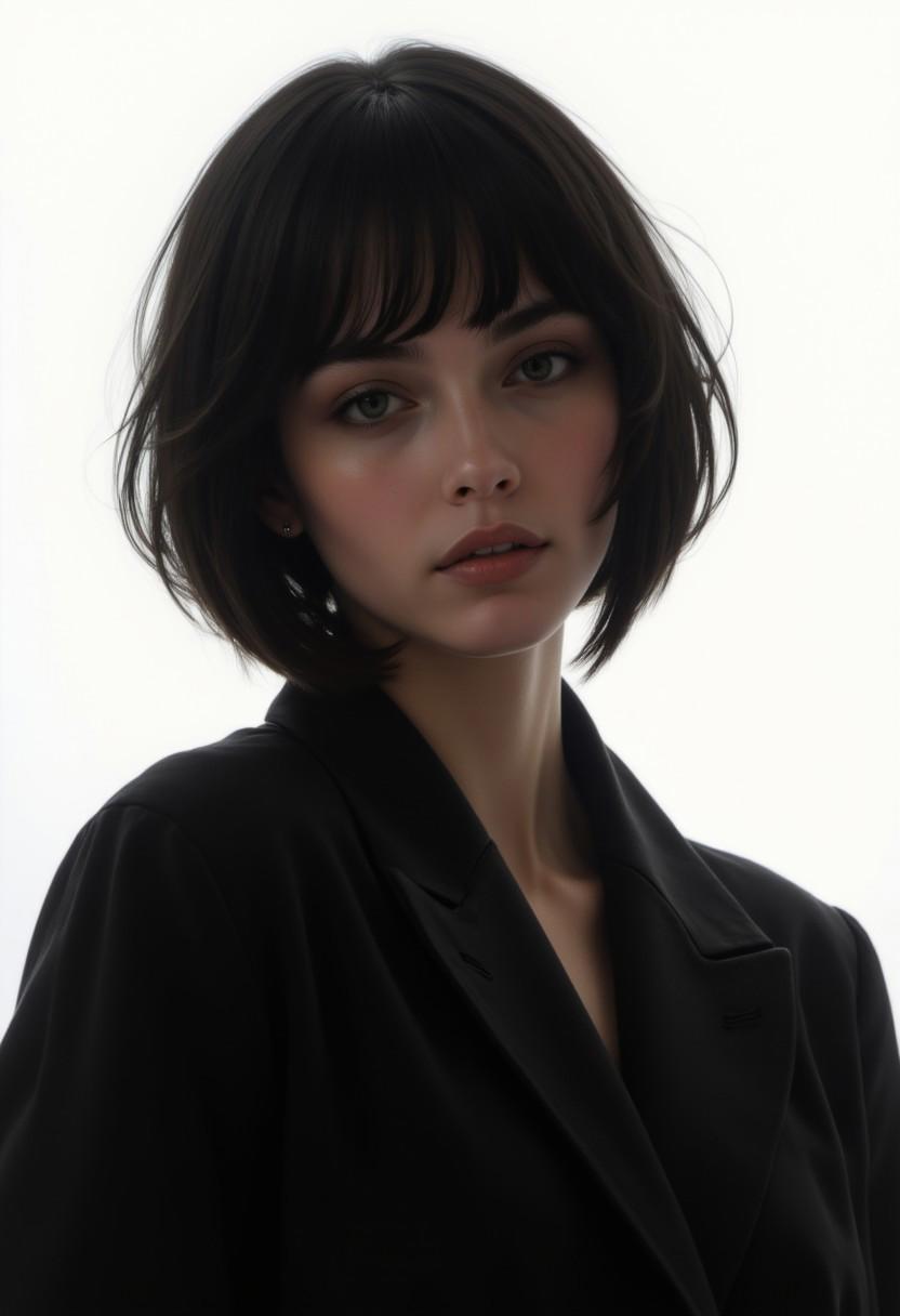 moody oil painting, a beautiful young Turkish woman with black hair in a very straight and sharp and geometric short cut wearing a black suit jacket with no shirt in front of a white background. She is facing the camera head on and is looking straight at the camera.
