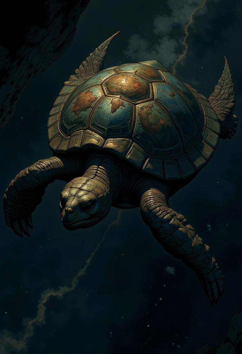 moody illustration, giant turtle with continent on her back drifting through space, visible brushstrokes