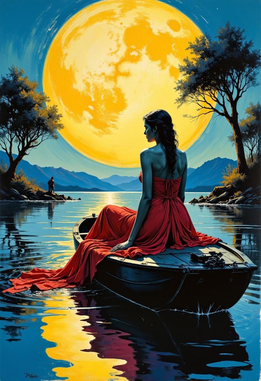 vivid image, a hauntingly sad but beautiful scene of a woman in a red dress sitting in a barge crossing a river, the environment and the woman are photorealistic but the river and the sky look like the van Gogh painting Starry Night giving the scenery the look of a collage made from photograph and painting, mixed medium, ink splashes, rough ink sketch, retro scan, 80s sci-fi, lofi, neon-pastel colours