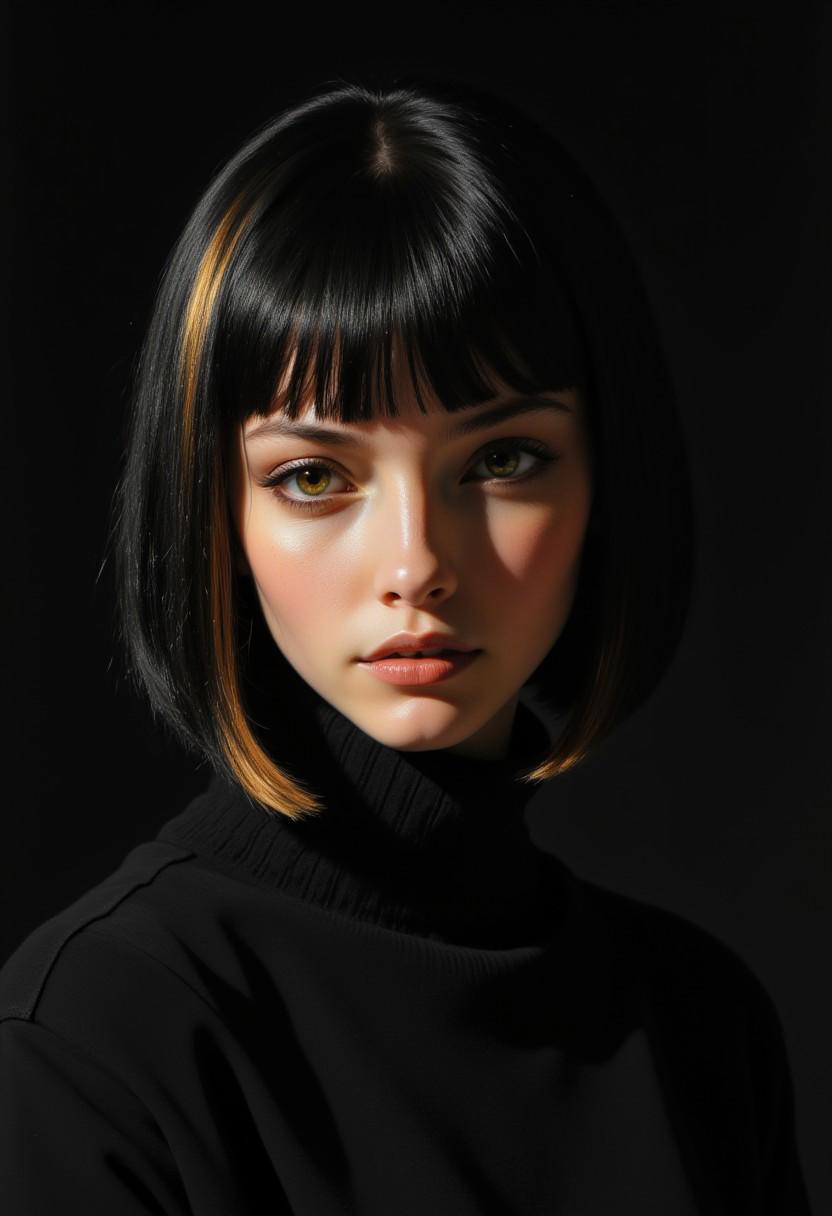 moody oil painting, a beautiful young woman with hair in a very straight and sharp and geometric short cut with the left side being black and the right side being gold. The woman has g black and gild lipstick. She is facing the camera head on and is looking straight at the camera.
