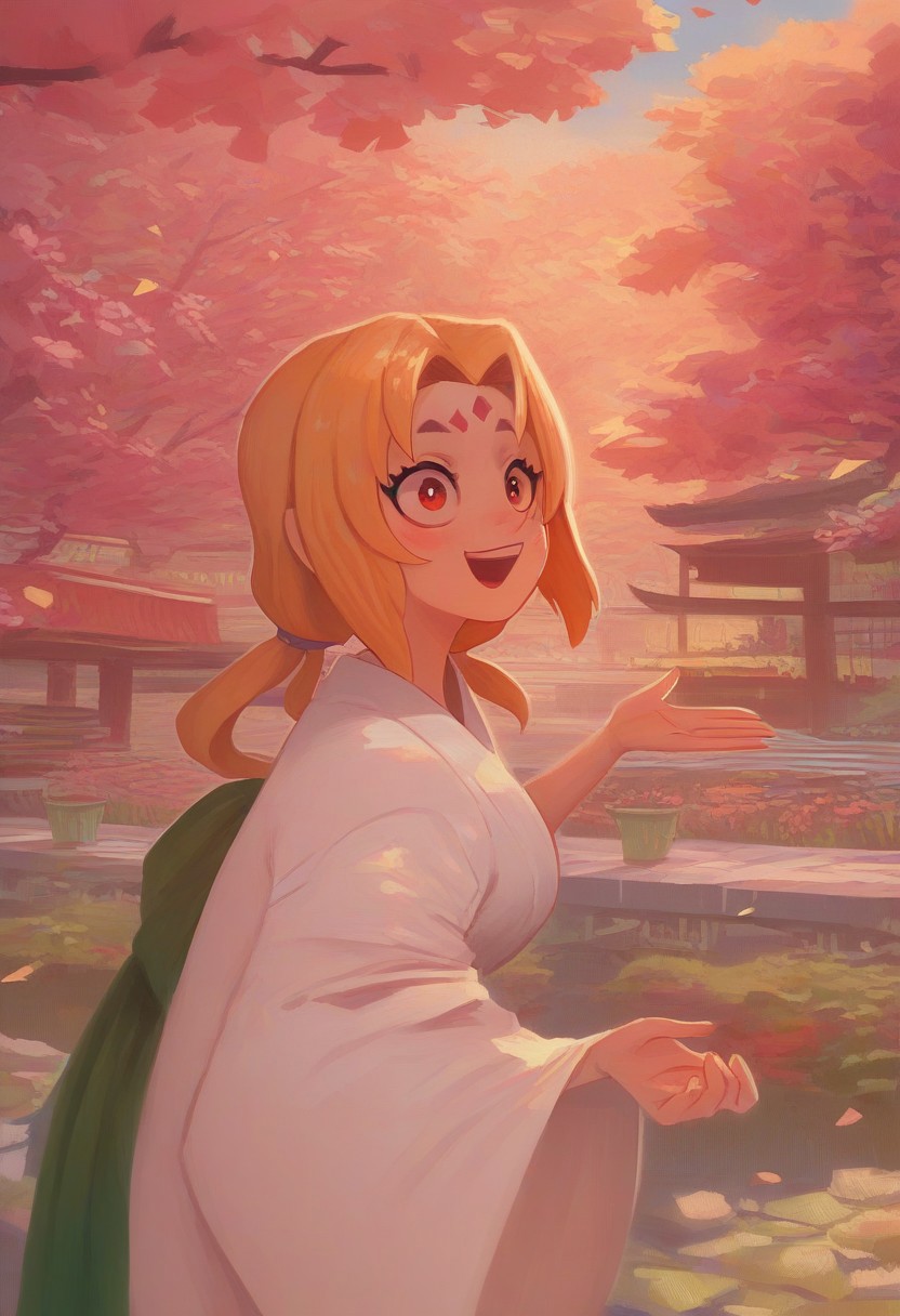 TR00L00, score_9, score_8_up, masterpiece, best quality, absurdres, vibrant, highly detailed, 1girl, solo, Tsunade as a child, kiddo Tsunade, white kimono, demure, japanese garden, zen, cherry trees, happy face, :D