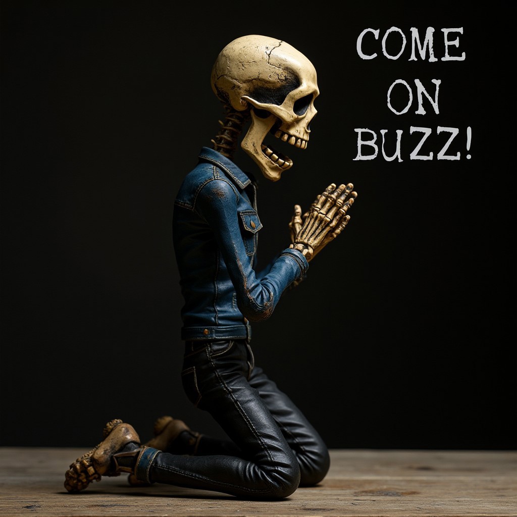 shouted "COME ON BUZZ!!" in bold clear texts. human scale TMGE skeleton FIGURE, kneeling and praying, in navy denim jacket and black denim pants. in a spotlight. dirty surface texture on the skeleton. high resolution, ultra detailed.