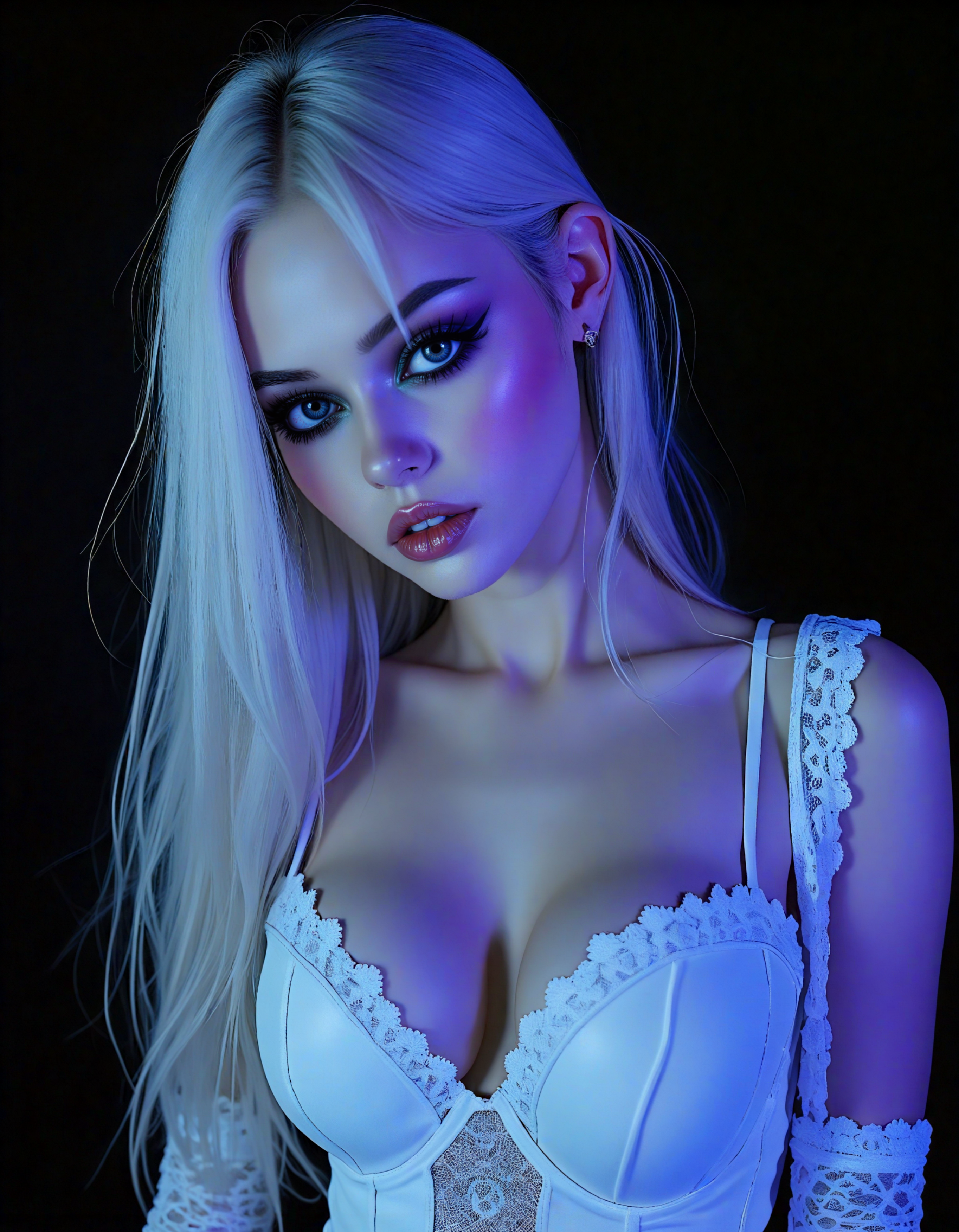 horror-themed a beautiful girl, sensual, seductive, with bold eyeliner, dark makeup, cheeky expression, closed mouth, large covered breasts, beautiful cleavage, white skin tight lace bodysuit, slim body, small waist, gloves, lace elbow gloves, covered erect nipples, gloves. long white hair with pink strands, multicolored hair. irresistible beauty, unusual composition, highly detailed, Soft Shadows, catchlights, extreme close-up shot,upper body shot,infrared filter,light painting . eerie, unsettling, dark, spooky, suspenseful, grim, highly detailed