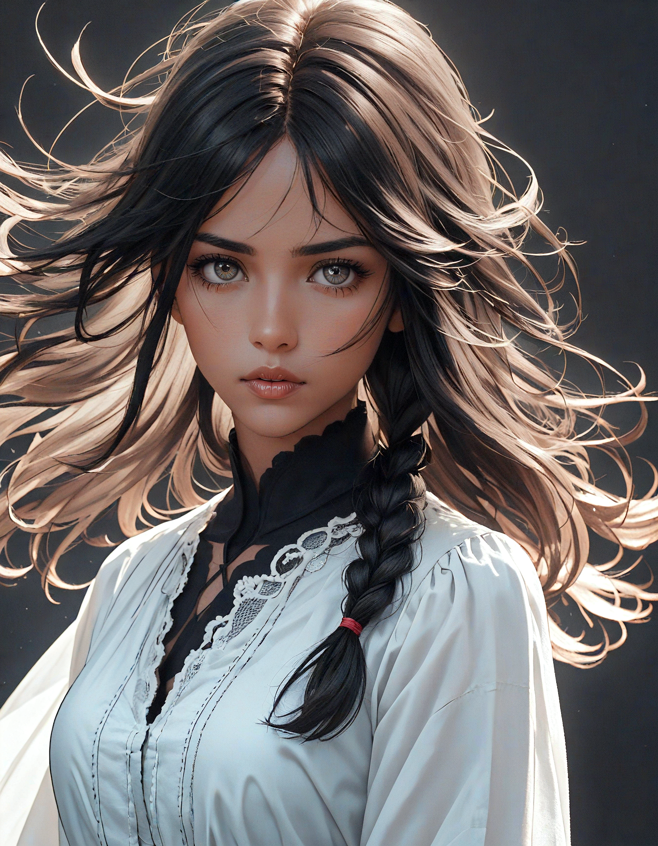 a high-resolution black-and-white photograph featuring a young woman with light skin and long, dark hair styled in a loose braid draped over her shoulder, she has a serious, contemplative expression with large, almond-shaped eyes looking directly at the camera, her lips are full and slightly parted, giving a sense of introspection, she is wearing a partially unbuttoned, light-colored blouse with a high collar, which appears to be made of a soft, textured fabric, the blouse is adorned with delicate lace details, adding a touch of elegance to her attire, the background is a solid, dark black, which contrasts sharply with her light skin tone, making her the focal point of the image, the lighting is soft and diffused, casting subtle shadows that accentuate her features and the texture of her clothing, the overall mood of the photograph is introspective and contemplative, with a focus on the subject's face and the delicate details of her attire and accessories, the photograph captures a moment of quiet introspection and introspection, style by Luis Royo,bloom light