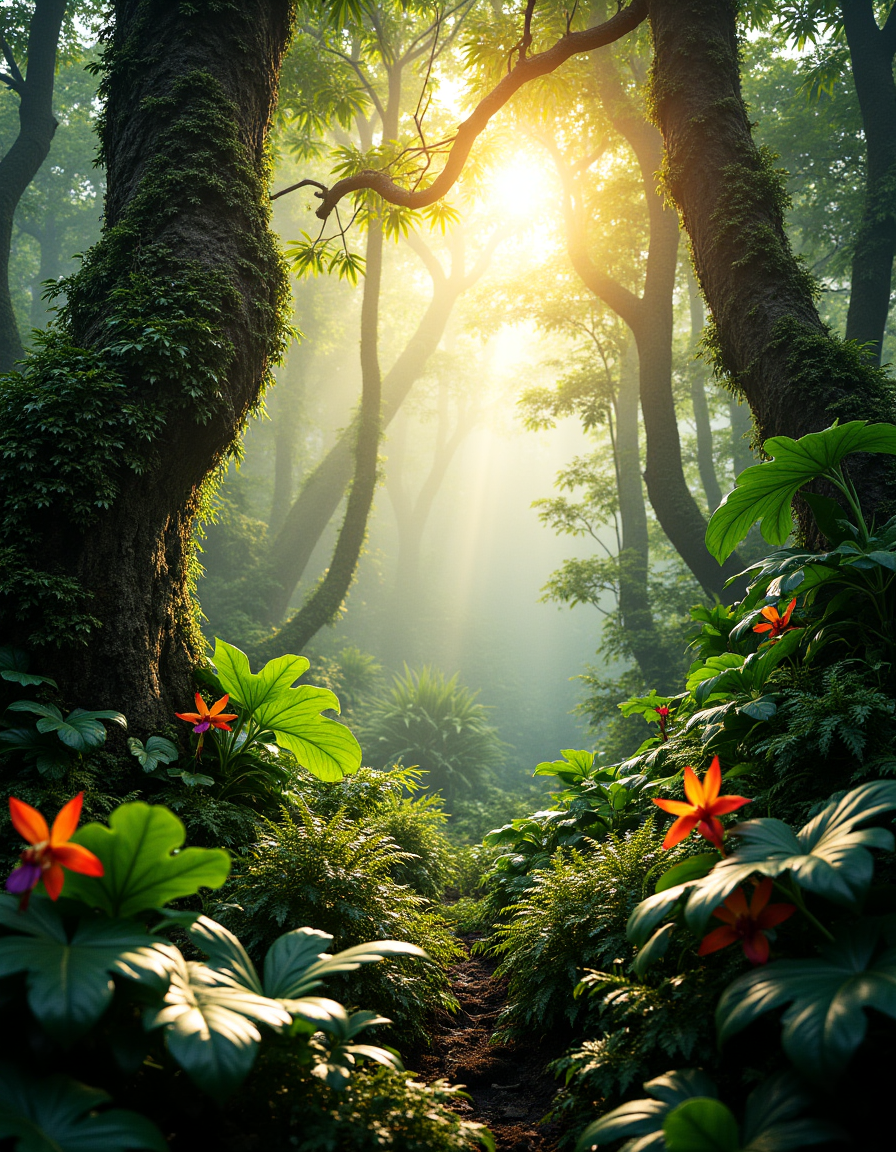A vibrant, lush jungle scene captured in the golden glow of sunlight filtering through the dense canopy. Towering tropical trees dominate the frame, their trunks wrapped in thick, winding vines and moss. The sunlight pierces through gaps in the leaves, creating dramatic shafts of light that illuminate the rich greenery below. The foreground features large, dew-covered leaves glistening in the light, with delicate ferns and undergrowth forming a layered composition. Brightly colored flowers, such as orchids or heliconias, add splashes of vivid red, orange, and purple, contrasting against the deep emerald tones. In the background, hints of a misty haze linger, adding depth and a sense of mystery to the jungle. The scene is alive with texture: the rough bark of tree trunks, the velvety softness of moss, and the glossy surfaces of tropical leaves. The sounds of distant bird calls and the rustling of leaves in the gentle breeze are almost palpable, creating a sense of immersive serenity. Technical Details for Photography Rendering: Camera: Canon EOS R5 Lens: RF 24-105mm f/4L IS USM Settings: 35mm focal length, f/4 aperture, ISO 400, 1/160s shutter speed Lighting: Natural sunlight with soft dappled highlights and shadows, enhanced by the slight haze in the atmosphere for added depth. <lora:Phlux:0.5>