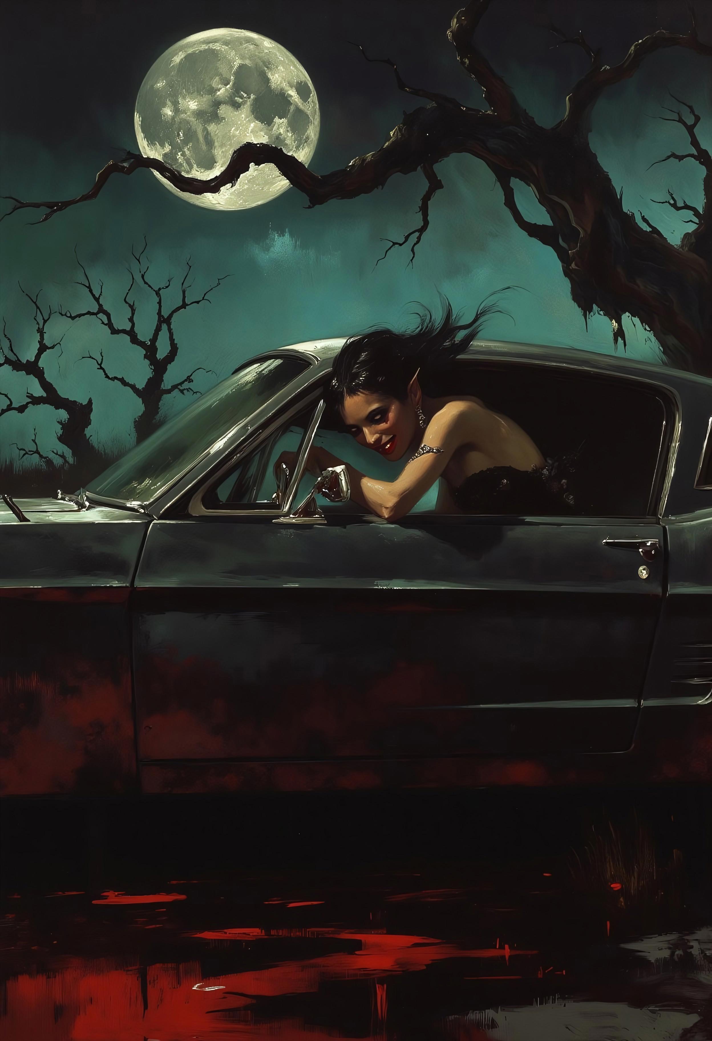 masterpiece, high quality, high rez, 8k, A seductive vampire woman is behind the wheel of an old black Ford Mustang, painted in a gothic oil painting style inspired by Rembrandt, Caravaggio, and Gustave Courbet. She turns her head toward the window, her gaze locking onto the viewer with a captivating intensity. A mysterious and provocative smile lights up her face, revealing sharp, gleaming fangs under the faint glow of moonlight. Her features are both elegant and menacing: alabaster skin, lips painted a deep red, and eyes glowing with a supernatural brilliance. Her dark hair falls in untamed waves, framing her face in a wild, alluring manner. She wears a sleek black outfit that exudes both sophistication and danger. The old Mustang is rendered with striking realism, its elegant curves and matte black finish reflecting the cold moonlight. The interior of the car is shrouded in deep shadows, revealing only hints of worn vintage details. Through the slightly lowered window, the blurry exterior reveals a nocturnal landscape of twisted trees and an ink-black sky studded with stars. The color palette is dominated by deep blacks, silvery grays, and blood reds, highlighted by the diffused glow of moonlight playing off the car’s metallic sheen and the vampire’s gleaming fangs. The atmosphere is intensely gothic, blending mystery, sensuality, and menace.