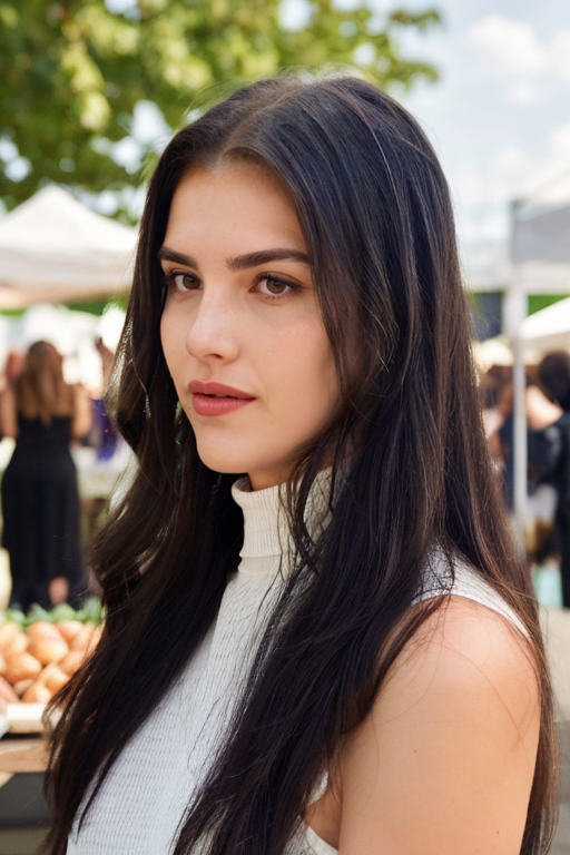 alexbotez, raw photograph, portrait, upper body, a woman wearing a high neck formal dress, outdoors farmers market, glowing hair, sharp lighting,, three-quarter view, <lora:alexbotez_v1_sd1.5_andyxn:0.50>