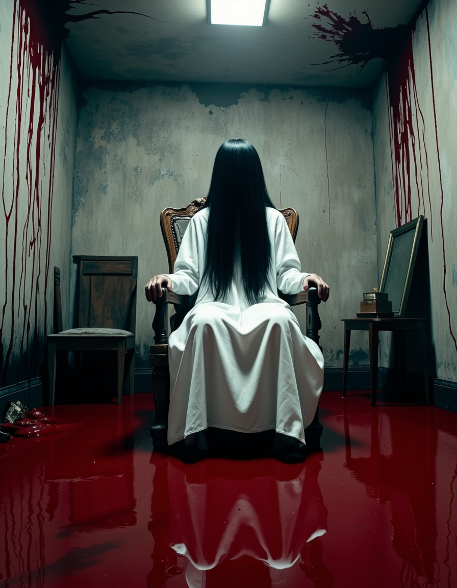 This chilling artwork depicts a faceless, motionless figure seated in a dimly lit, blood-stained room, evoking intense feelings of dread and isolation. The interplay of muted grays, stark whites, and blood-red tones creates a haunting and oppressive atmosphere. The reflective floor and cascading bloodstains reinforce themes of violence, supernatural horror, and psychological unease, making this a striking representation of horror and suspense.