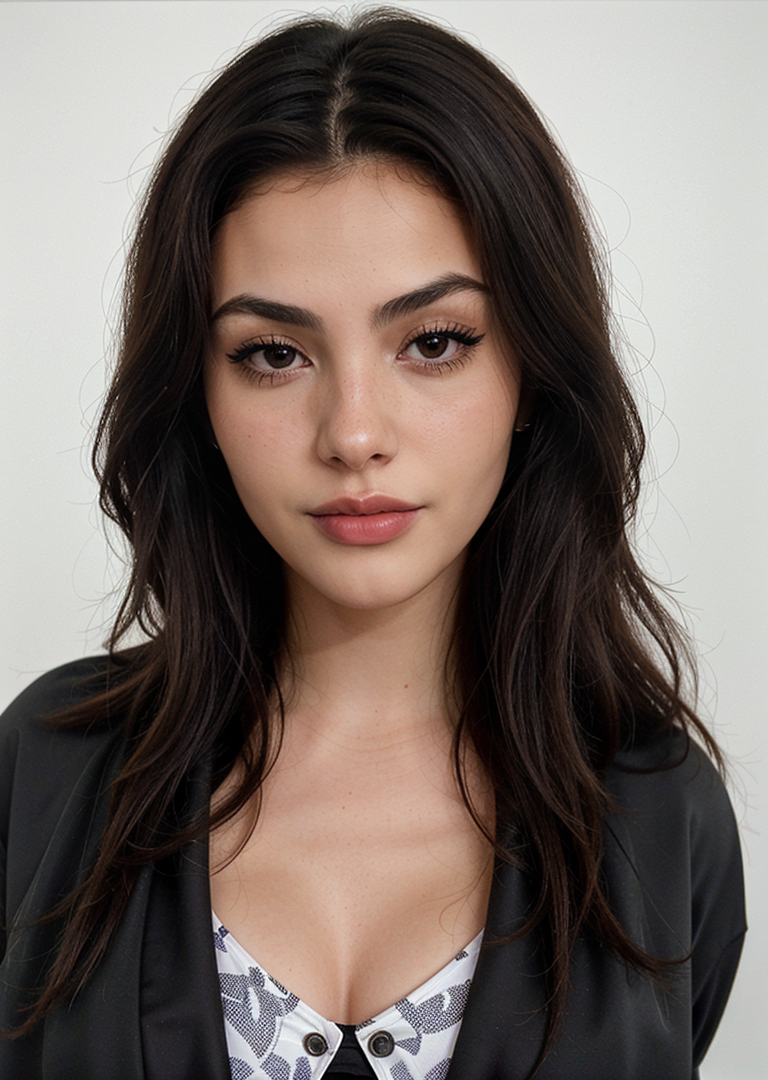 1girl, andrebotez, portrait, headshot, ((black jacket)), print tshirt, long sleeves,