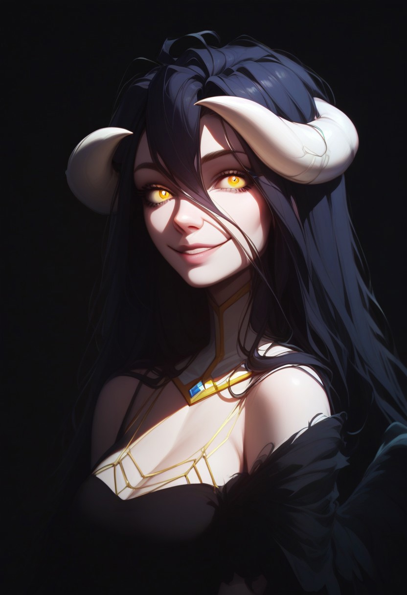 Blend_in, black background, score_9, score_8_up, score_7_up, masterpiece, best quality, absurdres, vibrant, highly detailed, very aesthetic, portrait, 1girl, solo, slimes_albedo, black wings, black dress, looking at viewer, (smile:0.8)
