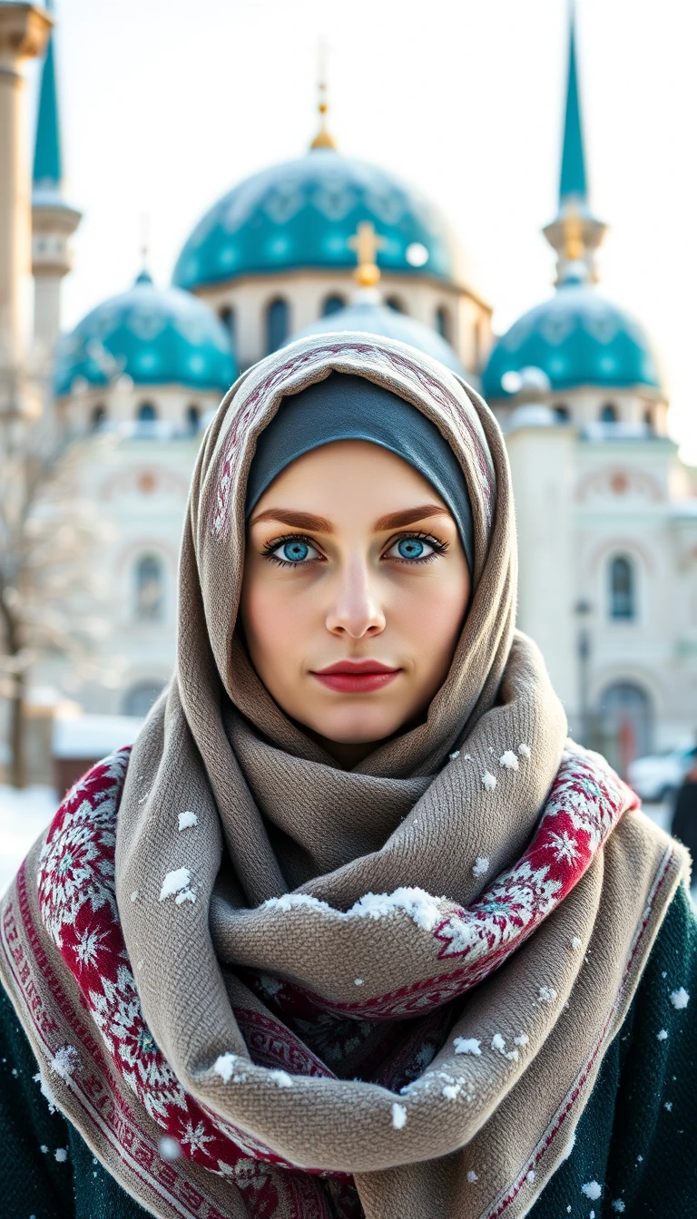 "A Russian Muslim woman with blue eyes and red cheeks from the cold, wrapped in a thick, embroidered hijab and a wool coat, standing in front of a snow-dusted Persian mosque. The turquoise domes contrast beautifully with the white snow, and the scene is bathed in soft winter sunlight, captured in 4K with crisp, photorealistic detail."