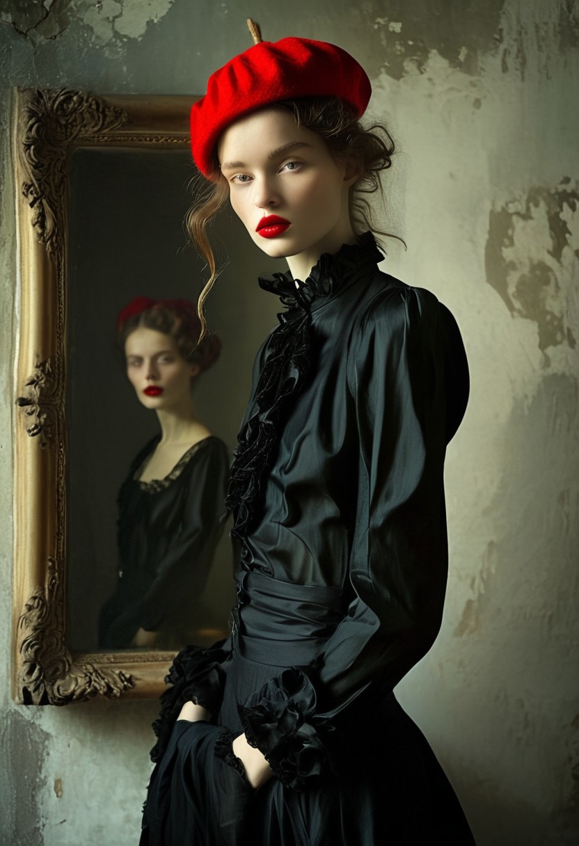 High fashion model photo, , irish woman, high detalied natural skin, (strange hair1.2), (like Orla Fitzgerald1.2), cute, suggestive, melancholic, elegant, trendy, stylish, Fauvism Art of elegant clothes, rpg, gothic, medieval, dark Olivier Valsecchi, Albert Benois, Samuel Peploe, , artwork by Klee and Kandiskhy, (red hat1.2), photo by (Paolo Roversi1.2), studio lighting, Rembrandt lighting, rim lighting, Bauhaus still background, low angle shoot, sharply focused, trending of artstation