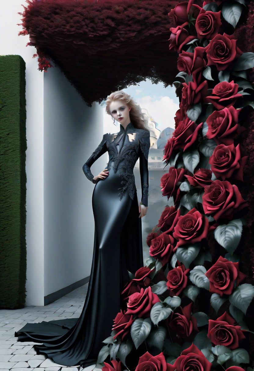 A large dark red rose bush shaped like a beautiful girl BREAK, striking blue eyes, a garden in Florence,