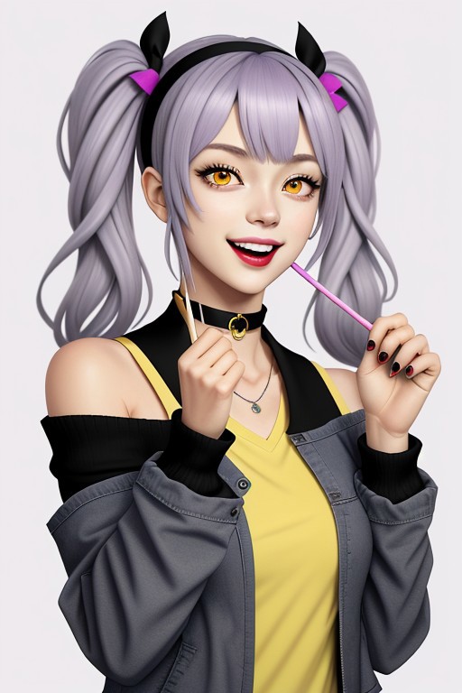 1girl, murasaki shion, virtual youtuber, lollipop, food, solo, candy, twintails, grey hair, long hair, purple nails, holding lollipop, holding food, hair ornament, holding candy, jacket, looking at viewer, choker, holding, yellow eyes, jewelry, nail polish, necklace, crescent, upper body, hair ribbon, eyeshadow, ribbon, alternate costume, off shoulder, open mouth, bare shoulders, green background, teeth, makeup, purple jacket, camisole, arched bangs, crescent hair ornament, smile, collarbone, hairband, orange eyes, black ribbon, long sleeves, blunt bangs, black choker
