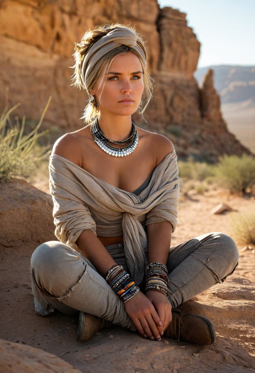 Super details a young desert wanderer, sitting thoughtfully against a rugged rock formation with an expression that reflects both innocence and resilience. Her sandy blonde hair, loosely held back by a fabric headwrap, falls softly around her face, framing her wide, expressive eyes that gaze calmly into the distance. Created by Sasan, her attire is a collection of layered, earthy-toned fabrics that drape gracefully around her shoulders and torso, providing both comfort and adaptability to the harsh desert environment. Her arms, slender but strong, are decorated with multiple necklaces of varying lengths and materials, adding a subtle glint in the sunlight. Around her wrists and forearms, several bracelets and bands are intricately wrapped, giving her a unique, handcrafted look that reflects her resourceful lifestyle. Her legs are wrapped in rugged fabric leggings, patched and decorated with delicate charms, beads, and trinkets, showcasing her creativity and survival instincts. Each element of her attire is practical yet carries an individualistic style that hints at a life filled with adventure. She wears sturdy, well-worn boots, their thick soles and reinforced sides designed for traversing rough terrain. The subtle dust and scuffs on her shoes tell stories of countless miles traveled. Her posture is relaxed, with one arm resting on her knee, while her gaze remains contemplative, lost in thought amidst the vast and barren landscape around her. Created by Sasan.