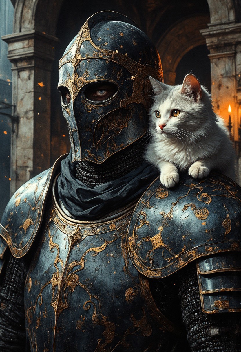 A hyper-realistic midshot portrait of a medieval knight wearing blackened steel armor adorned with gold filigree, exuding an air of mystery. The helmet features a crest of intricate, gothic designs, with the visor slightly raised to reveal piercing blue eyes. Nestled on the knight’s pauldron is a Persian cat with a luxurious, snow-white coat and striking amber eyes, its calm demeanor contrasting with the knight’s stern expression. The background is a dimly lit stone chamber, illuminated by flickering torchlight, creating dramatic contrasts that highlight the textures of the armor and the cat’s silky fur in exquisite 8K resolution.