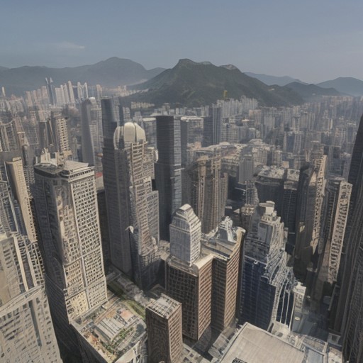 tall, narrow, tower, dystopian, black, Hong Kong, billboards, air conditioning units, short buildings around the main building, 2000s footage, nostalgic, vhs filter, construction, mountains in the background